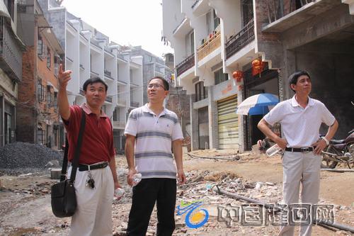 邓涛(中)在廖友学(左)的陪同下考察工商下街