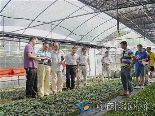 胡芒权(左二)一行视察叶家村金银花良种苗圃基地