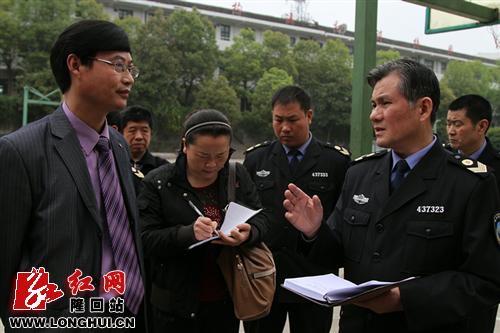 检查组向桃花坪中学负责人了解学校食堂卫生情况