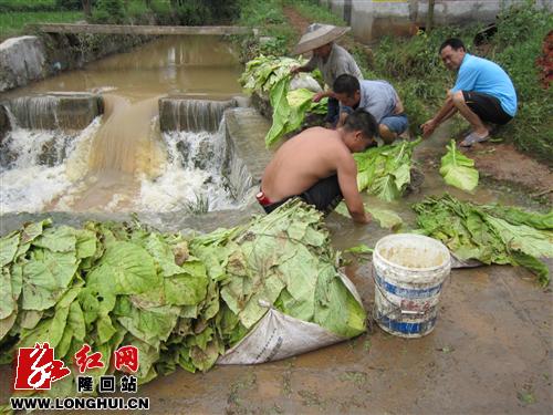 镇烤烟办副主任丁炳元等干部正在祝家村帮烟农把从烟田里采回来的被洪水沾满泥巴的烟叶冲洗干净