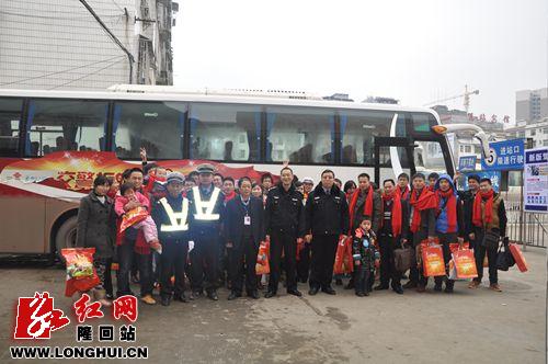 欢声笑语中,三个多小时的车程不知不觉就过去了。车子驶出隆回二桥路高速出口,只见前方悬挂“隆回交警热烈欢迎老乡回家过年”的大红横幅,一车人欢呼“到家啦!”爱心大巴徐徐驶入汽车总站,早有隆回县公安局副局长王紫明、隆回交警大队教导员阳学军、车站领导和工作人员等待迎接,王副局长表示对“交警护航 送爱回家”这种爱民为民的活动大力支持,并对回家过年的老乡表示热烈地欢迎。大家在站场工作人员的引导下进入小候车室,候车室设有春运交警服务站,热情的交通宣传志愿者们为回家老乡倒上热茶、端出糖果、递上交通安全宣传资料。在车站候车室,老乡们稍事休息,观看了宣传片、宣传展板,一对年轻小情侣掩饰不住满脸的幸福:回家了,真好!今年回家特别温暖!