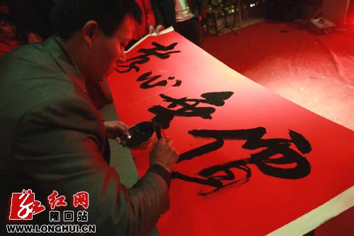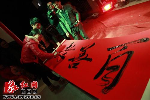 夜色渐深,飘动的舞台炫光和强有力的音响效果令每个人心潮澎湃,由张家村和乐团演奏的《金蛇狂舞》和《卡门序曲》、《拉德斯基进行曲》给晚会带来一片阳春白雪,加上村里年轻少女们跳动的流行舞曲《江南style》给晚会掀起阵阵时尚新风。广场舞、武术、快板、独唱等有如一道道时鲜小菜,清新扑鼻。小品《妇女开会》和《忍者神龟》虽有模仿和俗气调侃的味道,但演员们的“塑料普通话”加上地方方言听来亲切舒畅,入心入脑,给现场观众带来捧腹大笑。晚会中最让我感动的是以配乐诗朗诵和书法结合起来的自创节目《孝心无价》,真的让我震撼,张家村能在春晚上表彰一年来村民中周后其、刘凤花、刘应方等孝敬父母模范、爱妻模范、伟大母亲等各种道德模范,真是最能体现出在新农村建设过程中涌现出的一批感动乡村人物,这种榜样的力量有效促动了农村双文明建设的向前发展。