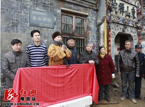 3月3日上午,大东山顶上满是冰凌雾淞,著名民俗摄影家老后先生携家人一早来到大东山禅院,将自己写下的一首《东山禅院抒怀》诗碑刻后立于禅院门口,县佛教协会会长应志法师以及县文艺界有关人士和附近村民参加了树碑揭幕仪式。