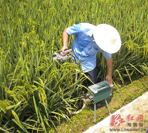 国家杂交水稻工程技术研究中心专家李建武用植物光合作用测定仪在田间测定了水稻的有效穗粒数,初步测算产量情况,为进一步采取有效措施,做好高产攻关提供了技术指导。