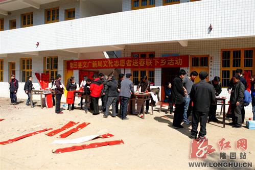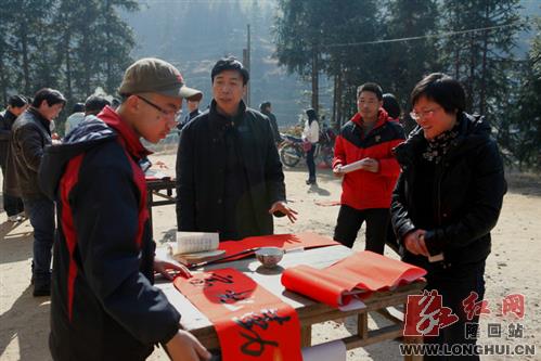 1月23日,县文广新局组织20多名文化志愿者来到羊古坳乡罗英村村级活动中心,为当地老百姓免费写春联300余幅,县领导罗海波、刘芬到场看望志愿者和老百姓。