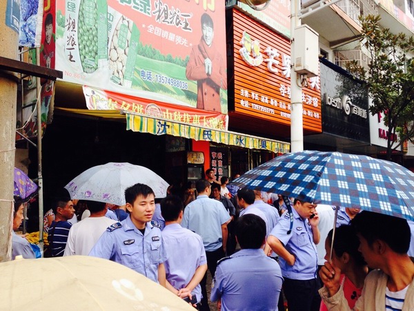 自隆回县城区城市管理综合整治行动开展以来,在指挥部办公室的统一协调下,县城管、交警、市管等部门充分联动,集中整治,取得明显成效。图为县城管执法局正在对桃洪中路梨子园岔路口一水果摊占道经营行为进行规劝。(手机拍摄)