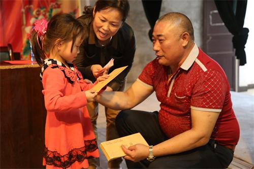 大鹏办事处计生办副主任肖庆艳(右一),隆回县人口和计划生育局党组书记、局长陈勇(右二)给留守儿童发放慰问金