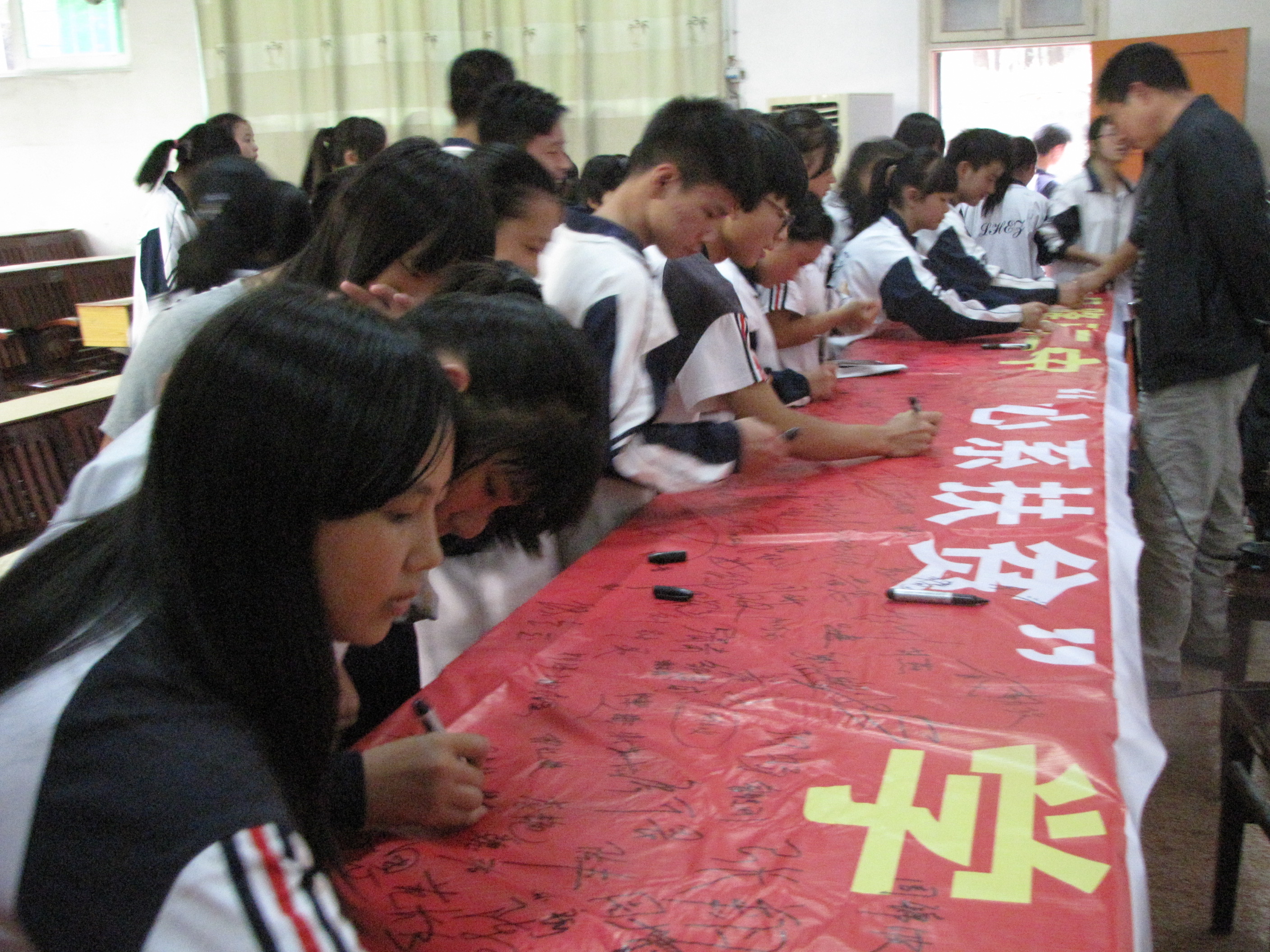 2014年10月17日是我国首个“扶贫日”。当天,由隆回县教育局组织的“邀你一起(1017) 扶贫济困”签名活动在隆回二中举行,学生依次在大型横幅上郑重签下自己的名字。副校长李柏树要求学生把“奉献爱心,倾注真情、关心社会、参与公益、投身实践、锻炼自我”作为人生的不懈追求,从小事做起,让爱的接力棒永远传递下去;献出一份爱心,帮助那些需要帮助的人。