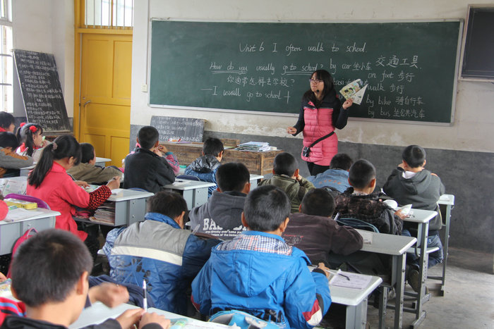 11月27日,湖南省隆回县西洋江镇苏河村小学,青年英语教师正在给孩子们上课。