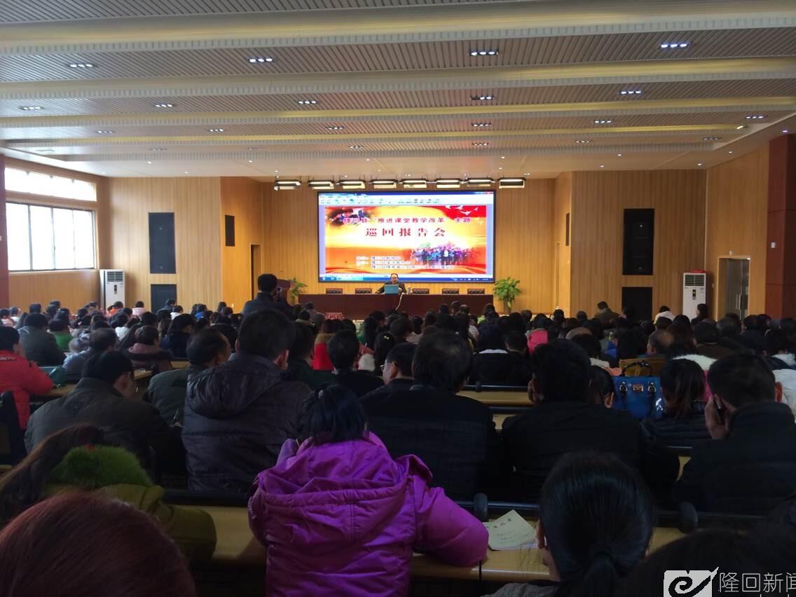 12月1日,隆回县九龙学校多媒体报告厅座无虚席,由隆回县教育局主办的“推进课堂教学改革”巡回报告会在此隆重举行,隆回九龙学校的全体教师认真听取了报告团成员精彩的课改主题报告。会场气氛热烈,不时传出雷鸣般的掌声。