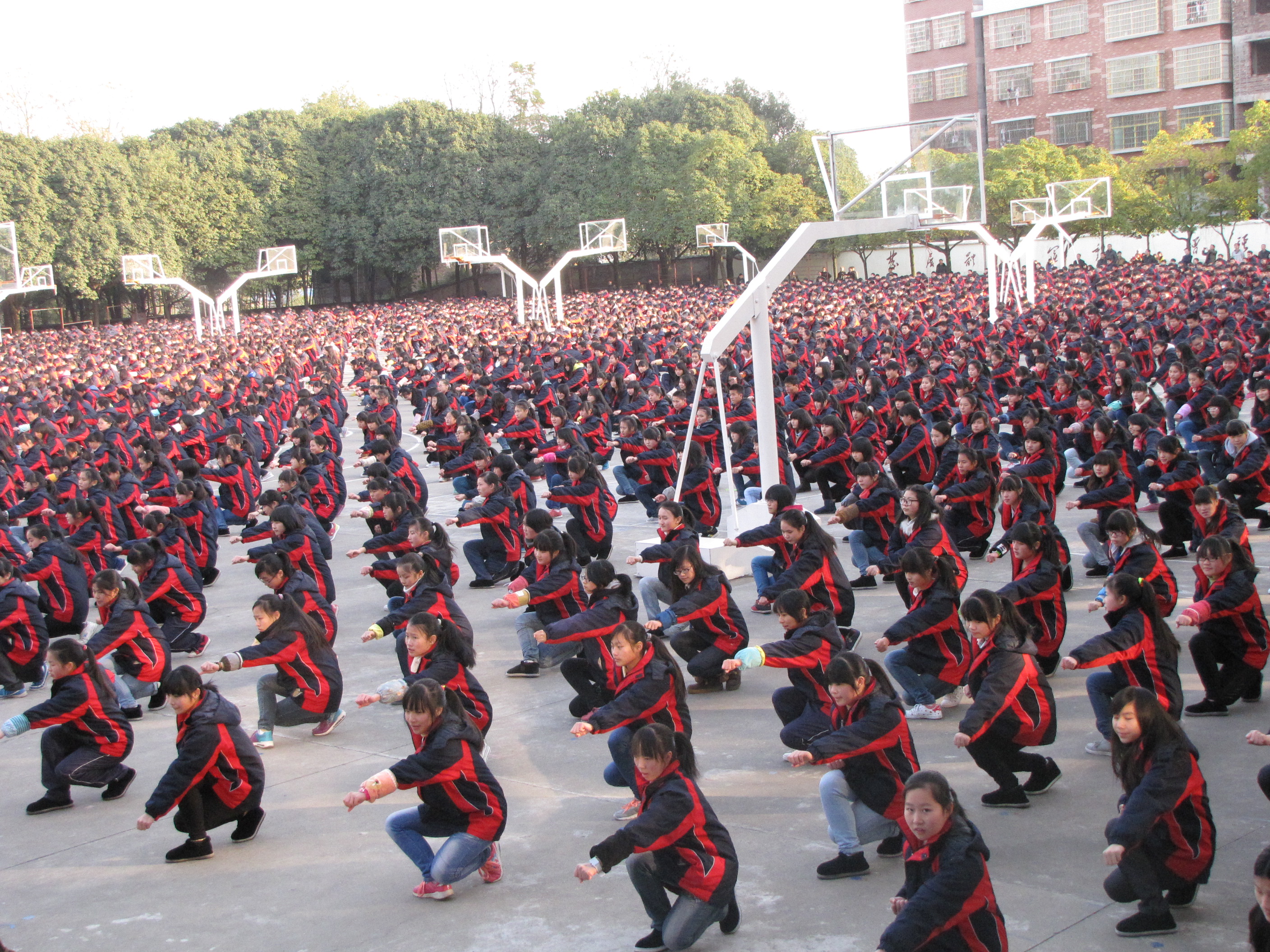12月16日,湖南省隆回县第二中学学生正在表演自创的武术。该校着力落实教育部每天在校运动时间不能少于1小时的规定,除了广播操以外,还自创了“角力”、“竹竿舞”、“武术”等五项学生喜欢的项目,从而让校园课间操丰富精彩起来。