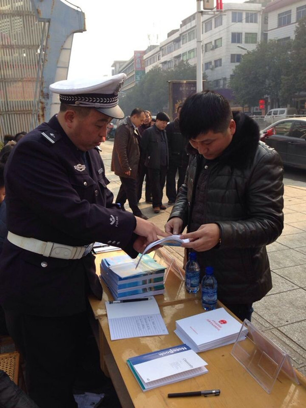 隆回交警大队交管中队副队长江伟向群众解答问题