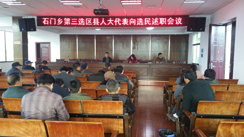 12月28日上午,石门乡人大组织召开县人大代表向选民代表述职的会议。全体班子成员和来自第三选区共35位选民出席会议。会上,长生村书记范水江和天劲建材厂总经理李建华分别向选民代表汇报了工作。