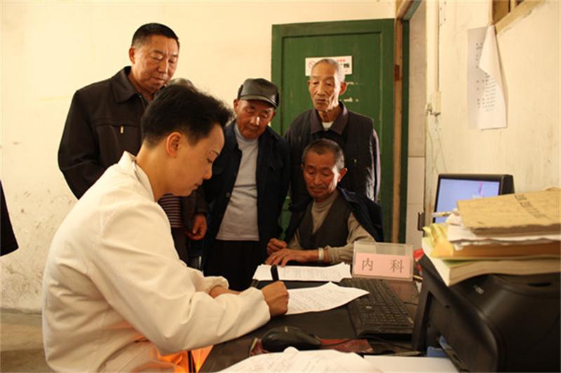 图为市优抚医院巡诊医师为南岳庙镇优抚对象诊断病情与开具处方