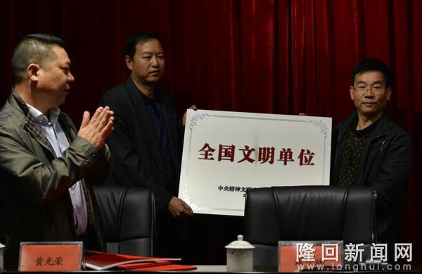 隆回新闻网讯(图/卿燕生 文/王玉超)【欢迎关注隆回新闻网微信公众号——天下隆回】4月21日,邵阳市委宣传部副部长林少林,市文明办主任黄光荣、副主任龚进跃受湖南省文明办委托,为“全国文明单位”获得单位——隆回县财政局、“全国文明村镇”获得单位——隆回县司门前镇授牌。县委常委、宣传部长卿小玉主持仪式。县委常委、常务副县长汪庆春,县政府副调研员蒋盛海出席仪式。