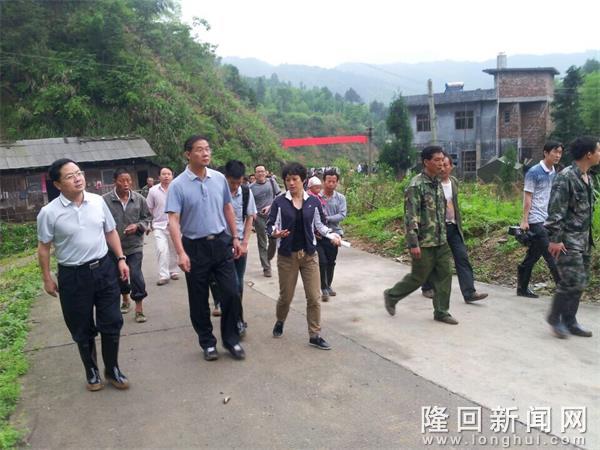 周春锦(前排左三)向民政部救灾专员介绍620洪灾灾情