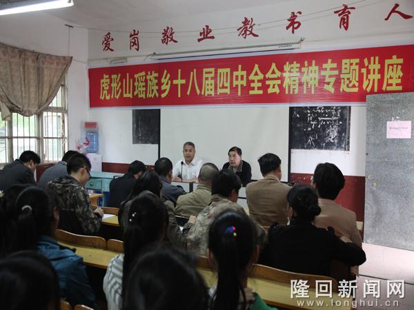 隆回新闻网讯【欢迎关注隆回新闻网微信公众号——天下隆回】“今天的讲座,让我深深地感受到了全面依法治国的深层次的涵义,以及其重要性和紧迫性,对今后依法开展工作具有指导价值。”乡干部奉雄新感慨。5月7日上午,隆回县虎形山瑶族乡举行干部职工集体学习讲座,认真学习党的十八届四中全会精神,讲座由乡党委书记袁愈绍主持,隆回县委宣传部副部长阳黎主讲。