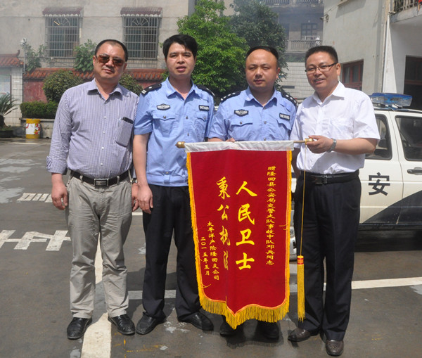 隆回新闻网讯 5月9日早上,太平洋保险公司隆回支公司的两名工作人员将一面写有“秉公执法 人民卫士”的大红锦旗送到隆回交警大队事故中队民警手中,以感谢交警快速侦破一起制造虚假交通事故骗保案。