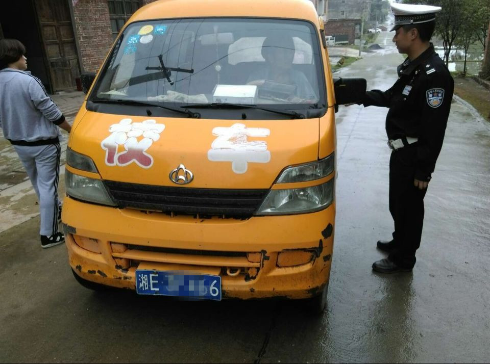 5月11日,隆回交警在荷香桥镇复元村路段蹲点截获一辆未取得校车标牌的车辆接送学生。
