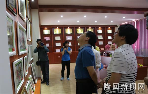 马健强一行在县特殊教育学校展览室连声夸赞学生作品