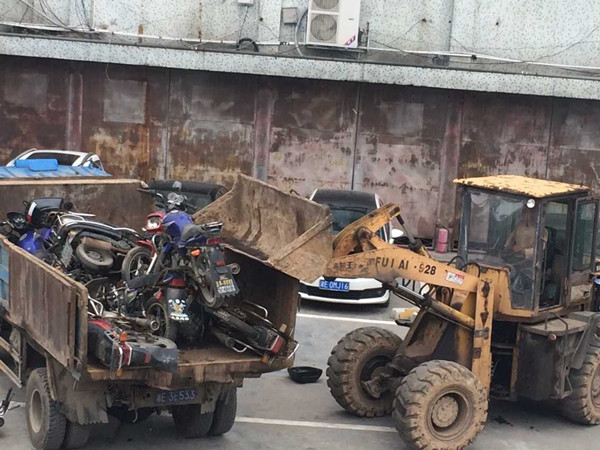 图为集中销毁报废的摩托车