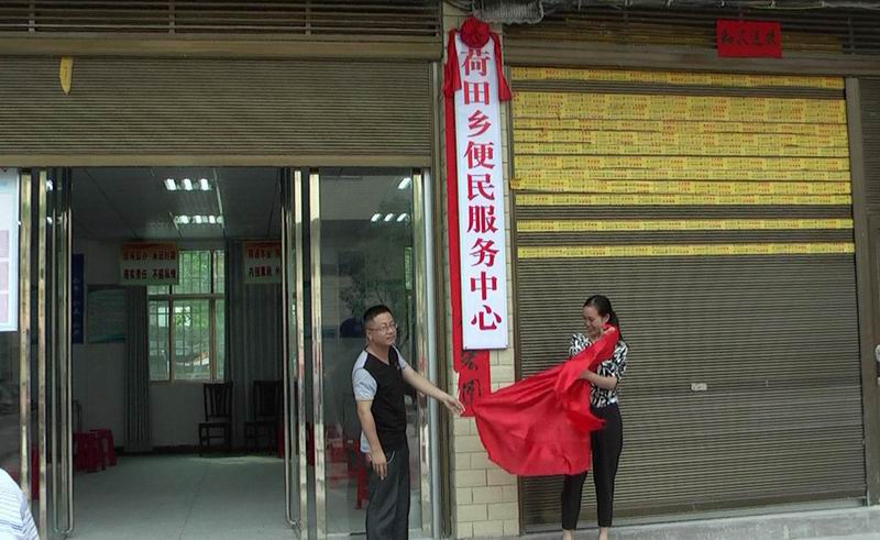 图为荷田乡党委书记魏彪(左一)、乡长胡江南(右一)在为乡便民服务中心揭牌