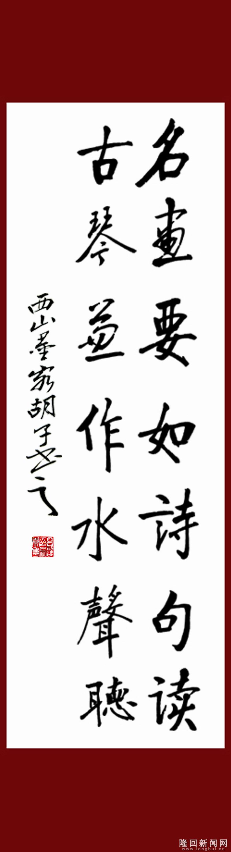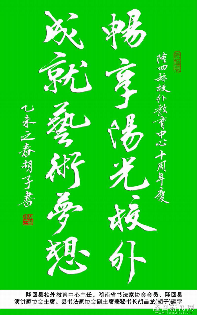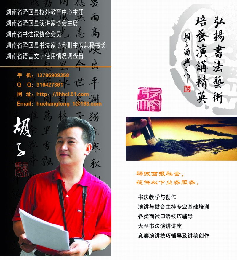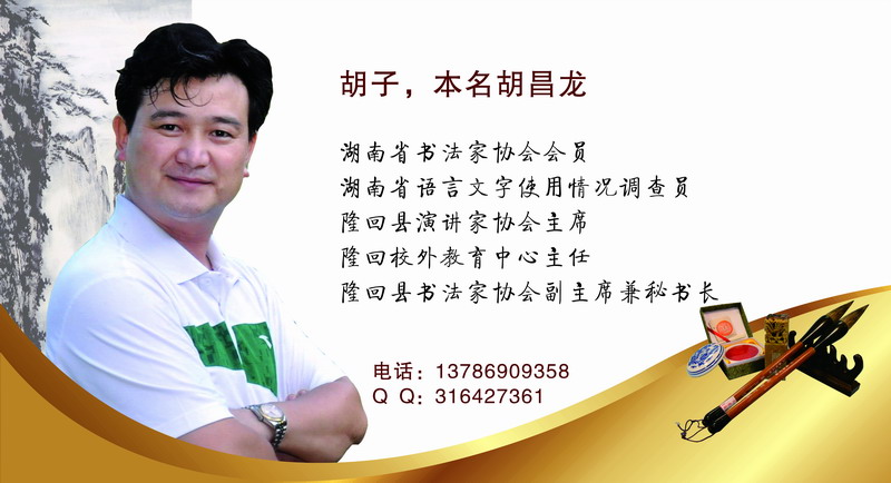 胡子,真名胡昌龙,自号西山墨客,1976年9月出生,中共党员,大学学历。现为湖南省书法家协会会员、隆回县演讲家协会主席、隆回县校外教育中心主任、隆回县书法家协会副主席兼秘书长。胡子研习书法20余年,笔耕不辍,尤以行书、楷书见长。其作品在各级各类大赛中获奖、展出或杂志整版刊发推介30余项(次),其中2007年获全国第九届世纪之星艺教展演活动行书一等奖、小楷一等奖。(联系电话13786909358)