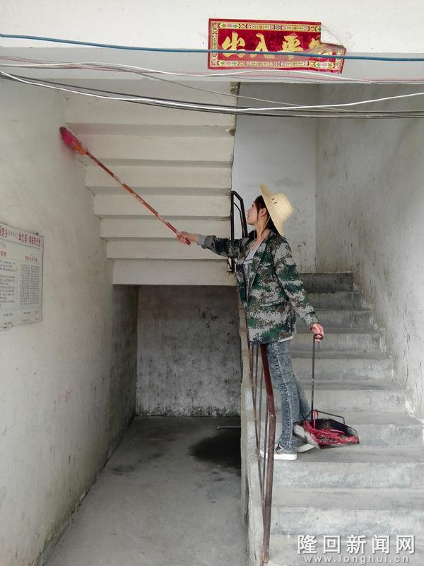 图为乡政府干部在打扫楼道卫生