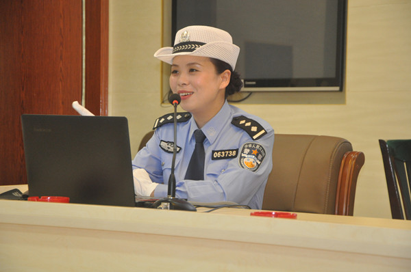 图为宣传民警匡慨向烟草公司职工讲解交通常识