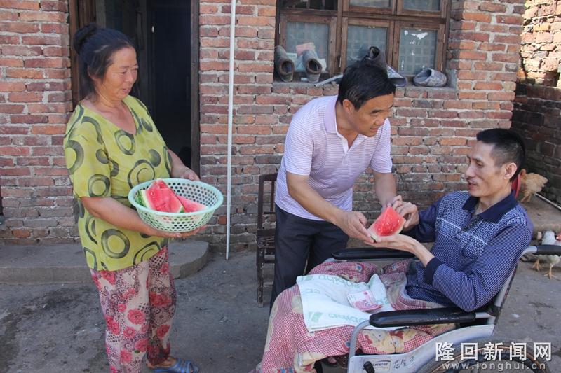 隆回新闻网讯 (通讯员 罗理力)【欢迎关注隆回新闻网微信公众号——天下隆回】7月29日,隆回县荷田乡中心校校长庞小青带领3名老师来到石门乡排头村,慰问全国道德模范候选人彭银凤及她的小叔子。端尿、喂饭,抱上抱下、推进推出,彭银凤10年如一日,就这样照顾着下身瘫痪的小叔子。更让人感动的是,她还30年如一日细心赡养过五位老人。她的事迹近日被媒体报道后,庞小青等深受感动,主动上门慰问。