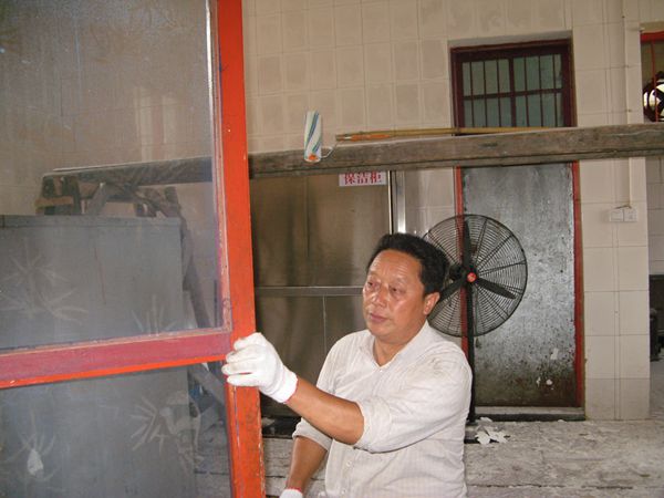 图为学校工作人员正在维修厨房大门