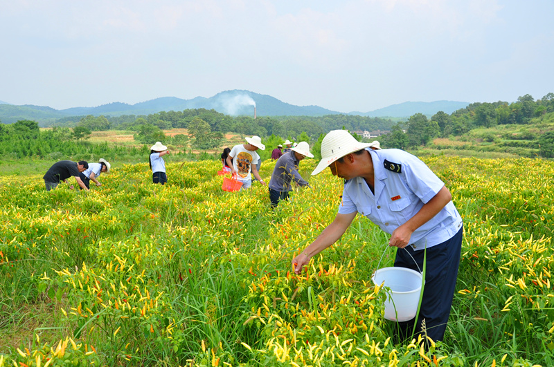 图为县地税局扶贫队员在烈日下帮村民采摘辣椒