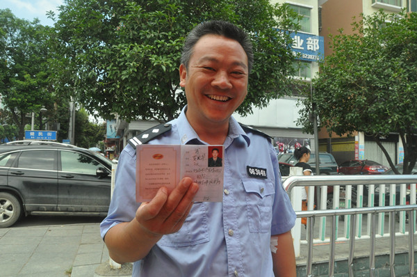 领到献血证后民警笑得十分开心