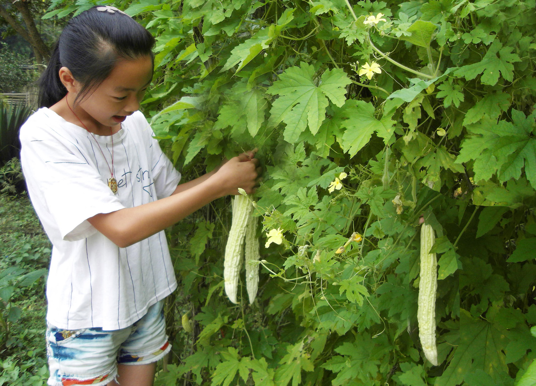 隆回新闻网讯 (通讯员 陈甫春)【欢迎关注隆回新闻网微信公众号——天下隆回】8月13日,隆回县小沙江镇芒花坪村留守儿童李雯雯在菜地里帮助家人摘苦瓜。暑假期间,该镇不少留守儿童帮助家人干一些力所能及的农活,既体验了劳动的艰辛,又学习了农业生产方面的知识。
