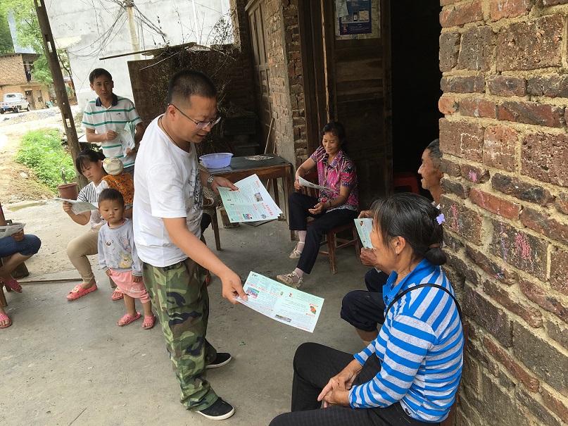 图为乡长张峰在黄羊村为村民发放宣传资料