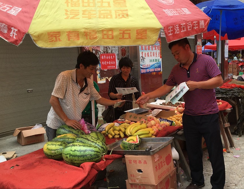 图为武装部长申健吾在千秋村边贸市场为摊主发放宣传资料