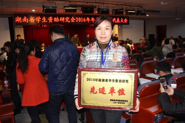 图为隆回县教育局工会主席刘建英在全省资助工作会议上领奖