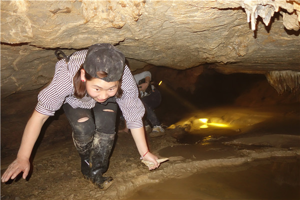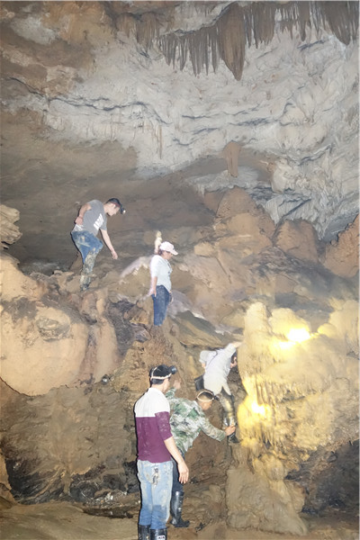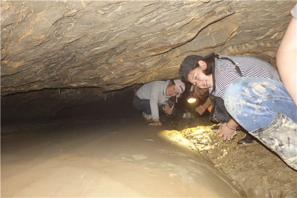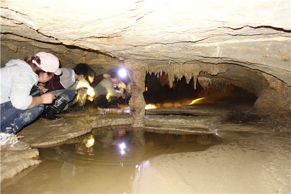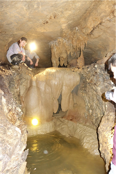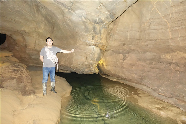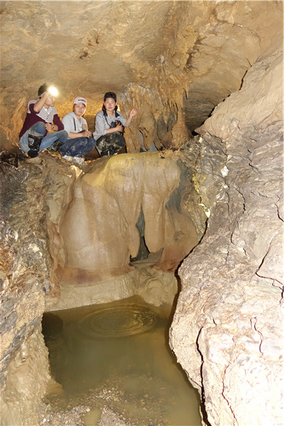 当考察组成员来到一水潭边时,只见潭里的水已有两米深,挡住了去路。老师们十分纳闷:早春与冬季进入该洞内考察时,潭水很浅,打赤脚轻而易举即可淌过去。那么是否因为前些日子连续下了半个多月的中雨,山泉往下渗,才使得潭里的积水加深呢?如此想来,这满潭水一定有源头。可这深深的潭水,也让考察组一些队员望潭兴叹,望水却步。于是,考察组最终留下的七名队员继续踏上探险之路,毫不退缩,勇往直前,克服重重困难,相继淌过三个深水潭。