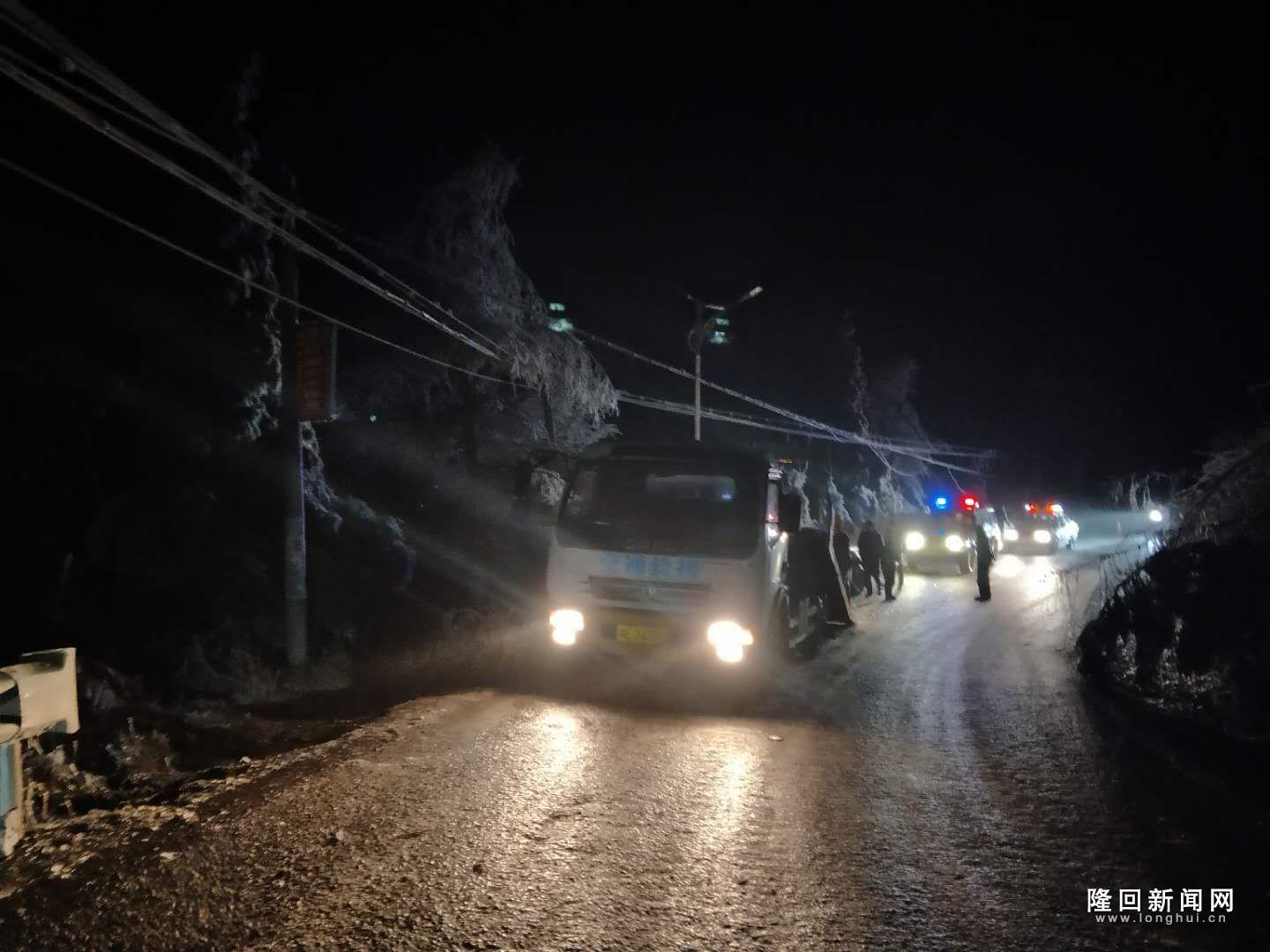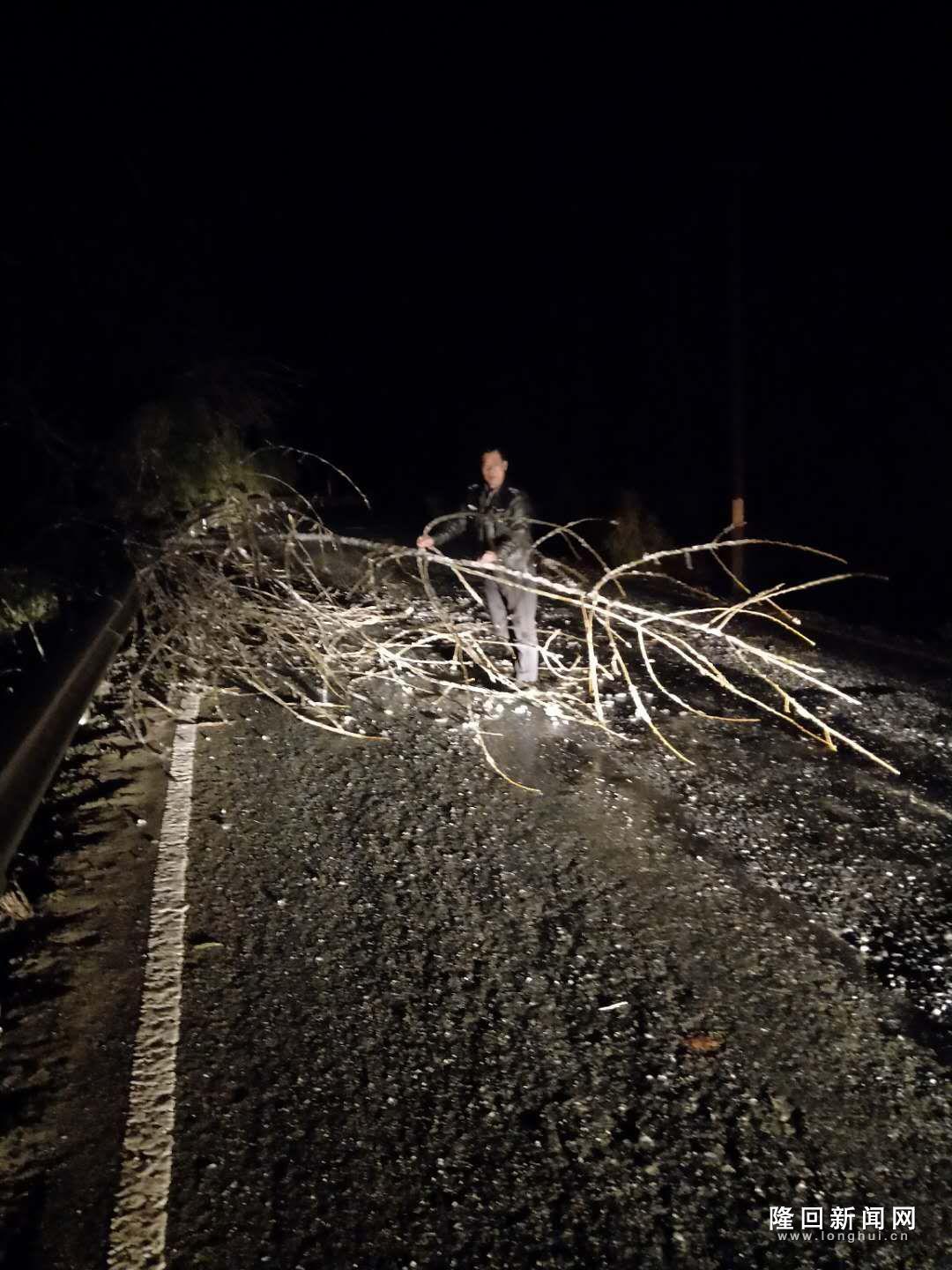 图为工作人员深夜清除路障