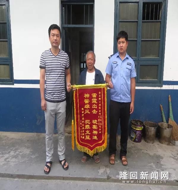 失主王某求为了感谢办案民警,特意将一面印有“雷霆出击、破案神速,神警雄风、犯罪克星”的锦旗送到派出所,对案件主办侦查员范建军、刘涛及全所人员表达谢意。
