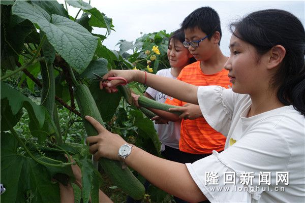 5月下旬,隆回县雨山铺中心学校科技组学生们,在采摘丝瓜。