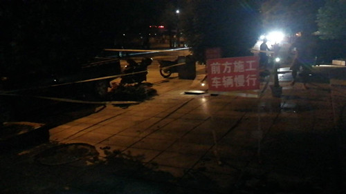 隆回县公用事业局工作人员在塌陷路面周边设置警示标志