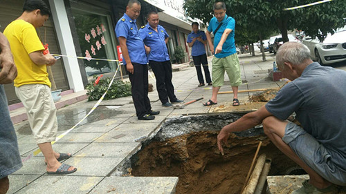 隆回县城管局和公用事业局工作人员组织工人对塌陷道路面进行修复