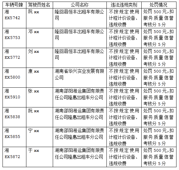 隆回新闻网讯(记者 胡权)2月21日,记者从隆回县城市公共客运管理所获悉,春节假期以来,交通执法人员继续加大路面巡查力度,发现湘EX5742、湘EX5753、湘EX5772、湘EX5800、湘EX5910、湘EX5838、湘EX5855、湘EX5872等8台出租车有违规行为,执法人员对上述车辆进行了立案查处,并按《巡游出租汽车经营服务管理规定》第四十七条第(三)项的规定对相关驾驶员进行了处罚,罚款500元,扣服务质量信誉考核分5分。