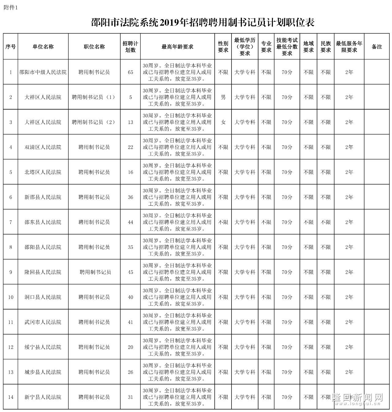 隆回新闻网讯(记者 杨汝舒 通讯员 贺金泉)5月27日,邵阳市中级人民法院发布《邵阳市法院系统2019年招聘聘用制书记员公告》,面向社会公开招聘市法院系统聘用制书记员439名,其中隆回县人民法院45名,将于5月31日起开始报名。