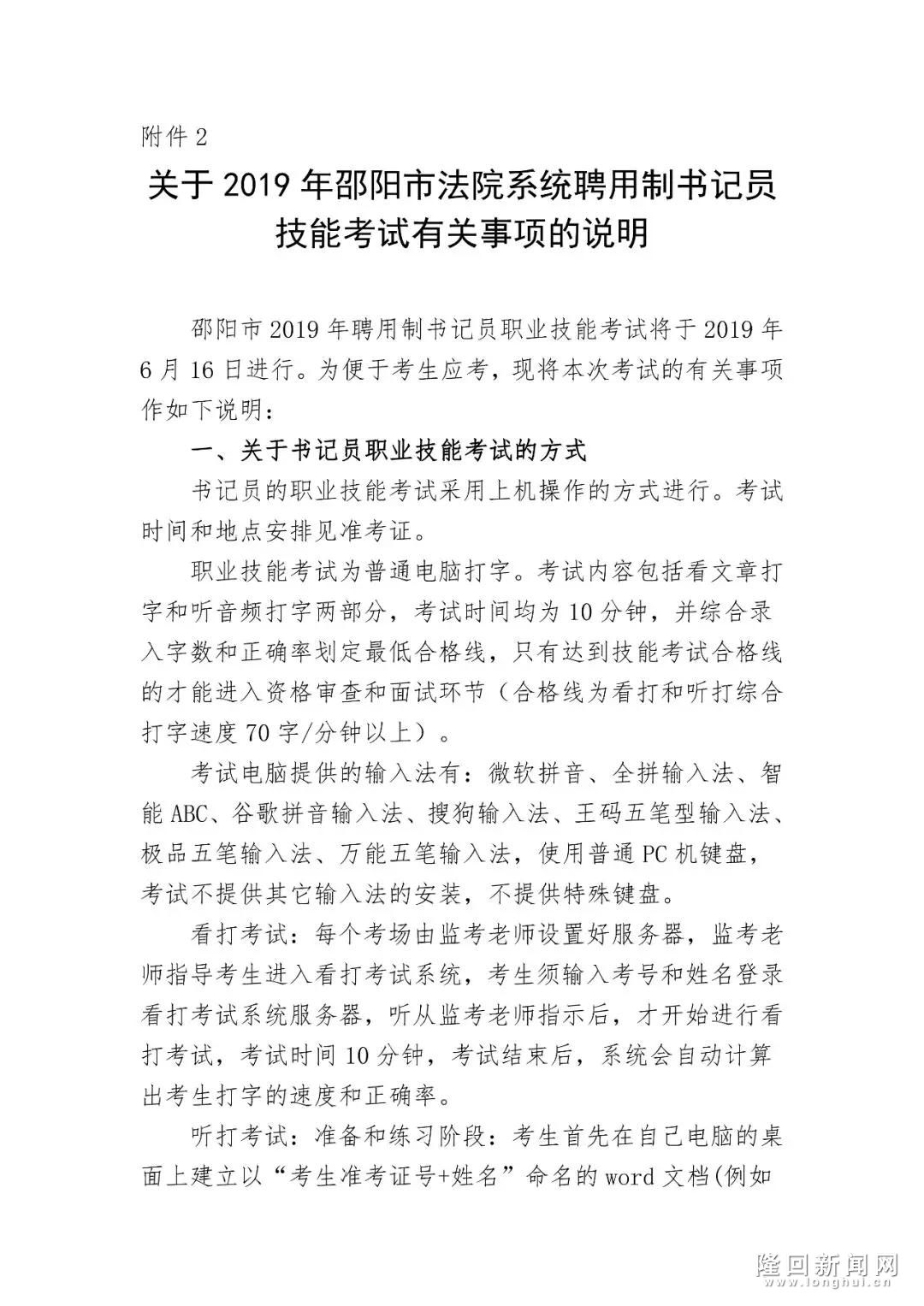 根据《公告》,此次招聘采取考试、考核方式,择优聘用。考试分为笔试、技能考试和面试,按考试综合成绩确定体检、考察、聘用对象。招聘考试采取网络报名方式,报名时间为2019年5月31日9:00至6月9日17:00。报考人员登陆邵阳市人力资源和社会保障局网进入“邵阳市法院系统2019年招聘聘用制书记员”报名系统,填写《邵阳市法院系统聘用制书记员报名登记表》。通过网上报名初审的报考人员可于2019年6月13日9:00至6月14日17:00自行在报名系统下载并打印准考证。