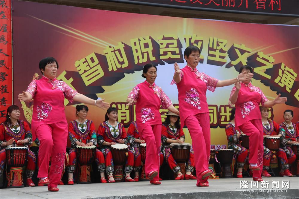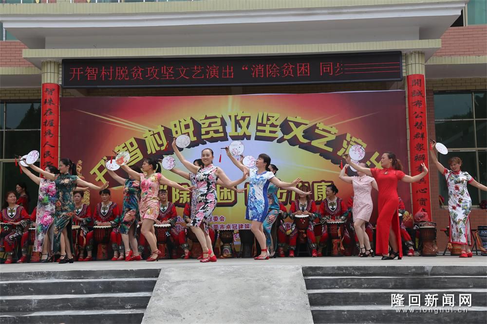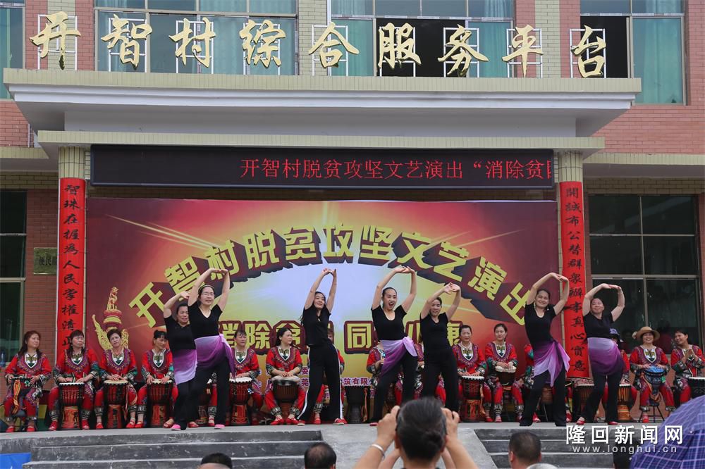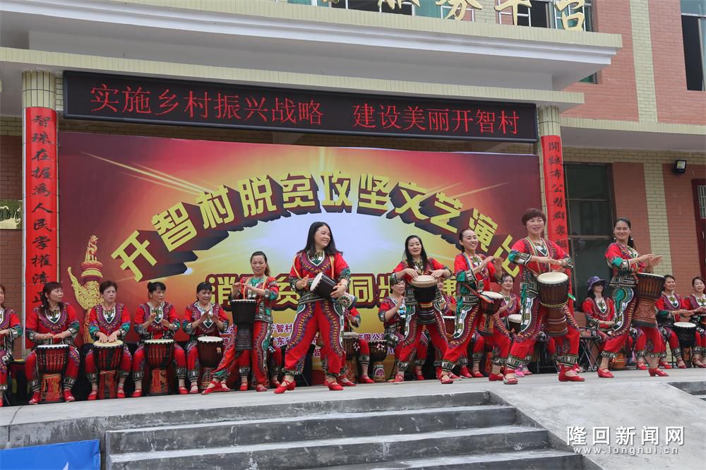 此次开智村脱贫攻坚文艺演出以“消除贫困同步小康”为主题,共有手鼓舞、健身操、扇子舞、独唱、花鼓戏等13个节目。