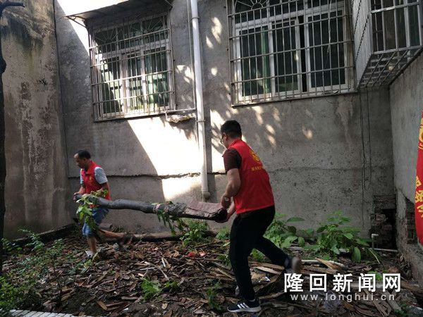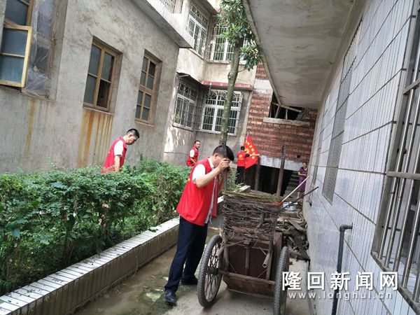 图为志愿者在清理卫生院墙内垃圾杂物