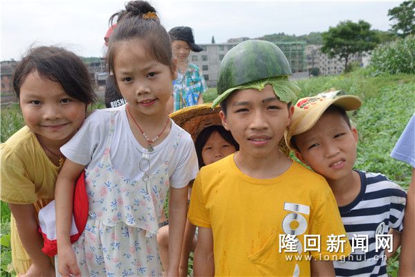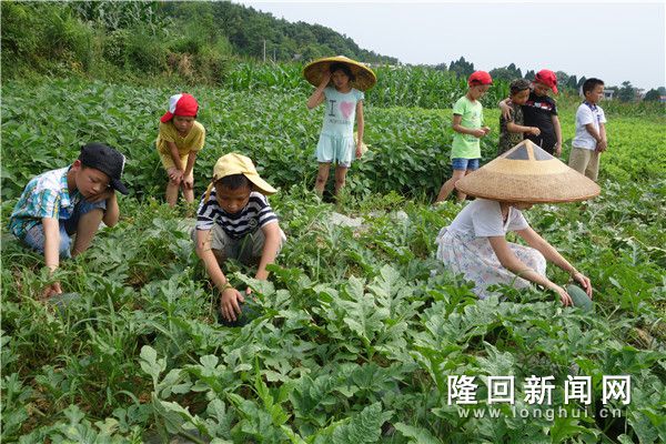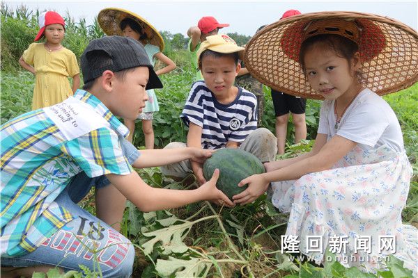图1-3为暑期伊始,邵阳市隆回县雨山中心学校科技组学生代表,在校外科技实践基地瓜果园采摘西瓜。