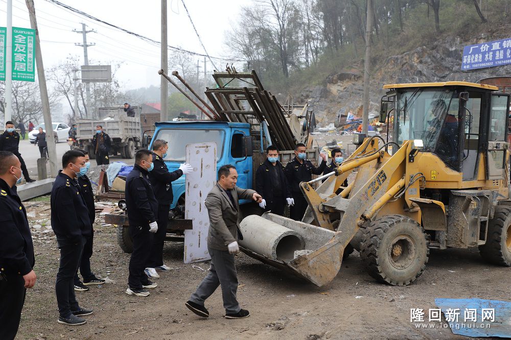 九龙路作为320国道的一部分,沿线的木材销售、垃圾收购、石材加工、汽车修理等门店长期店外经营,严重影响市容市貌,同时加工的石材粉尘没有采取有效的防护措施,造成扬尘污染。针对这一现状,执法人员对该路段所有门店的经营范围进行划分,督促店主在划定的区域内规范经营,同时对违规经营的门店下达限期整改通知书,责令当事人将超出规范区域的经营物品清理干净,禁止乱堆乱放。对部分拒不改正,依然我行我素的门店,该局组织执法人员、租用铲车和货运车辆进行集中清理和整治。